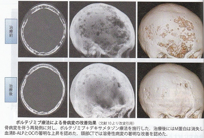 従来の抗ガン剤治療では骨病変の改善は認められなかったが、プロテアソーム阻害薬であるボルテゾミブは初回寛解導入療法や再発後のサルベージ療法として広く使用されているが、奏功例では骨病変の改善が認められている。