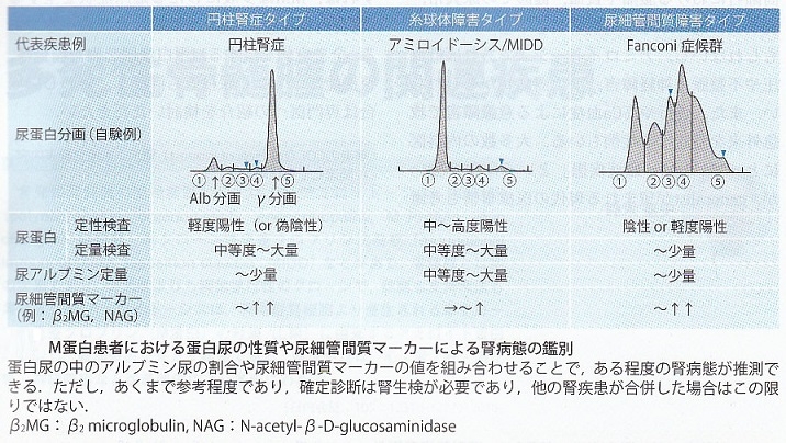 軽鎖に注目してみると、κ型は円柱腎症タイプ、尿細管間質障害タイプをきたすことが多く、λ型はアミロイド沈着により腎障害が出てくるので血清総蛋白上昇、血清アルブミン低下例が多い。