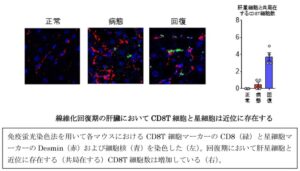 線維化回復期のCD8T細胞は、線維化病態において悪化させている肝星細胞と非常に近接して存在している。CD8T+Trm細胞の回復期における遺伝子発現を検討したところ、肝星細胞を近くに呼び寄せる作用を持つケモカインを非常に多く産生していることがわかった。肝星細胞の表面にあるこれらのケモカインを完治する受容体(CCR5)の発現を低下させたところ、CCR5の発現を低下させたマウスにおいて、線維化からの回復が顕著に遅れた。