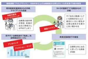 納得の医療を目指すためには、1.患者の声を可視化して伝える、2.インサイトのあるサービス戦略を生み出す必要があり、3.患者と医療側の共通認識の基盤を作る必要がある。